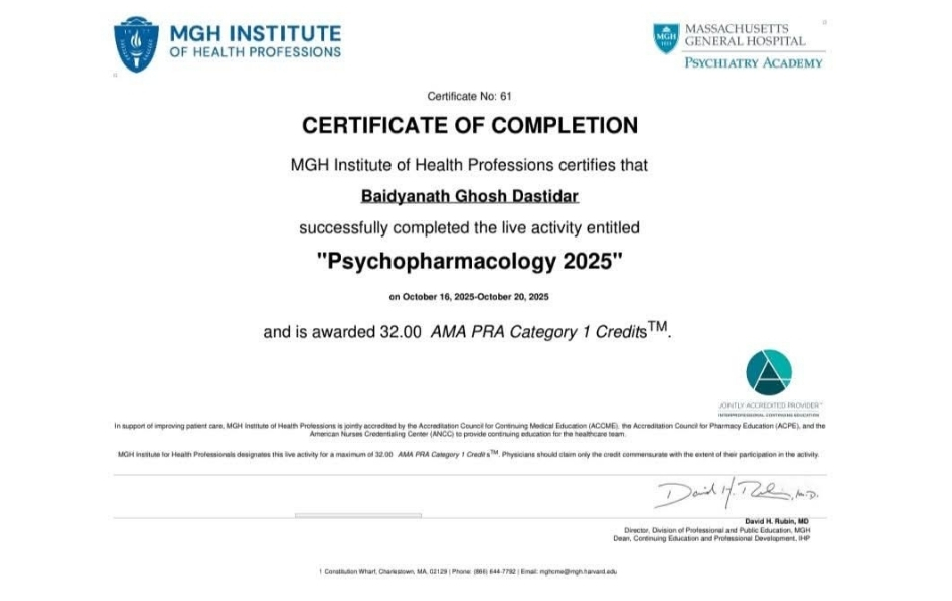 Dr. Baidyanath Ghosh Dastidar is a qualified psychiatrist (MBBS, MD Psychiatry) and currently serves as Assistant Professor of Psychiatry at Calcutta National Medical College, one of India’s oldest and most prestigious medical institutions.